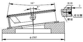 蝶板组合件起密封作用的零件是密封圈,密封圈为斜锥结构,其锥顶角为16°,厚度为13.5mm,由5层石棉板及4层不锈钢板复合而成(图6)。密封圈必须与蝶板和压环等组装在一起,加工时才能防止密封圈夹层中的不锈钢板及石棉板翘曲变形。根据其结构特点,对蝶板组合件密封圈采用以下加工方法:(1)先在2.5m立车上分别把蝶板和压环上的各止口加工到图纸要求尺寸,外圆不加工;(2)按图纸要求对压环钻孔,蝶板钻孔攻丝;(3)压环、密封圈和蝶板按图纸装配,将蝶板组合件工装用螺栓紧固在阀体工装上,然后再将蝶板组合件装夹其上。立车刀杆旋转8°车压环、密封圈和蝶板至磨削尺寸;⑷用同样厚度钢板替下密封圈,车压环、蝶板各锥面至图纸尺寸;(5)工装不动,将压环、密封圈、蝶板重新按要求组装,然后在立车刀架上装磨头,对密封圈进行磨削处理,使其达到图纸设计粗糙度要求。